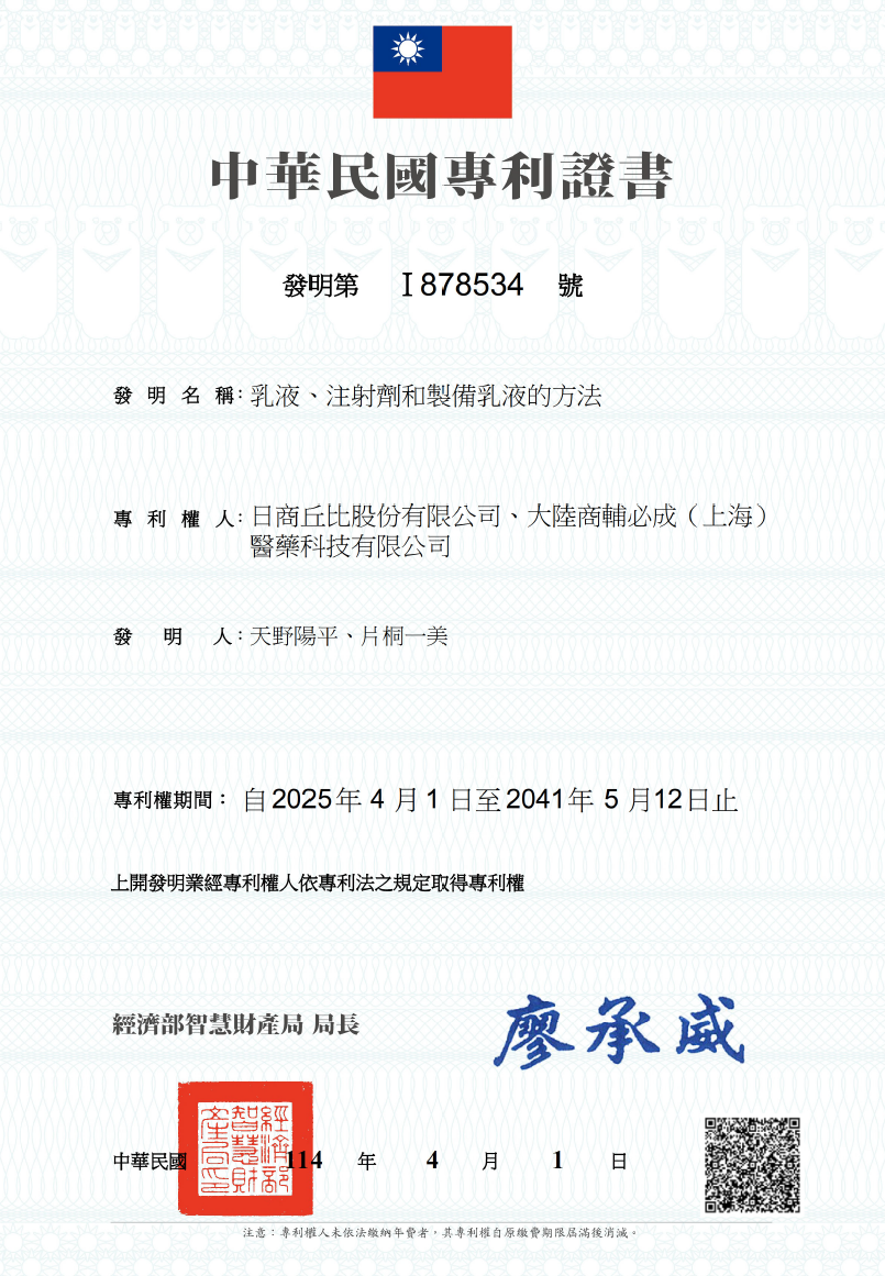 捷报传来,由bv1946伟德官网(上海)医药科技与日本丘比股份有限公司联合研发的 「乳液、注射剂和制备乳液的方法」 正式获得中国台湾地区发明专利证书(证书号:I878534)!这标志着我司在复杂注射制剂领域迈出关键一步。